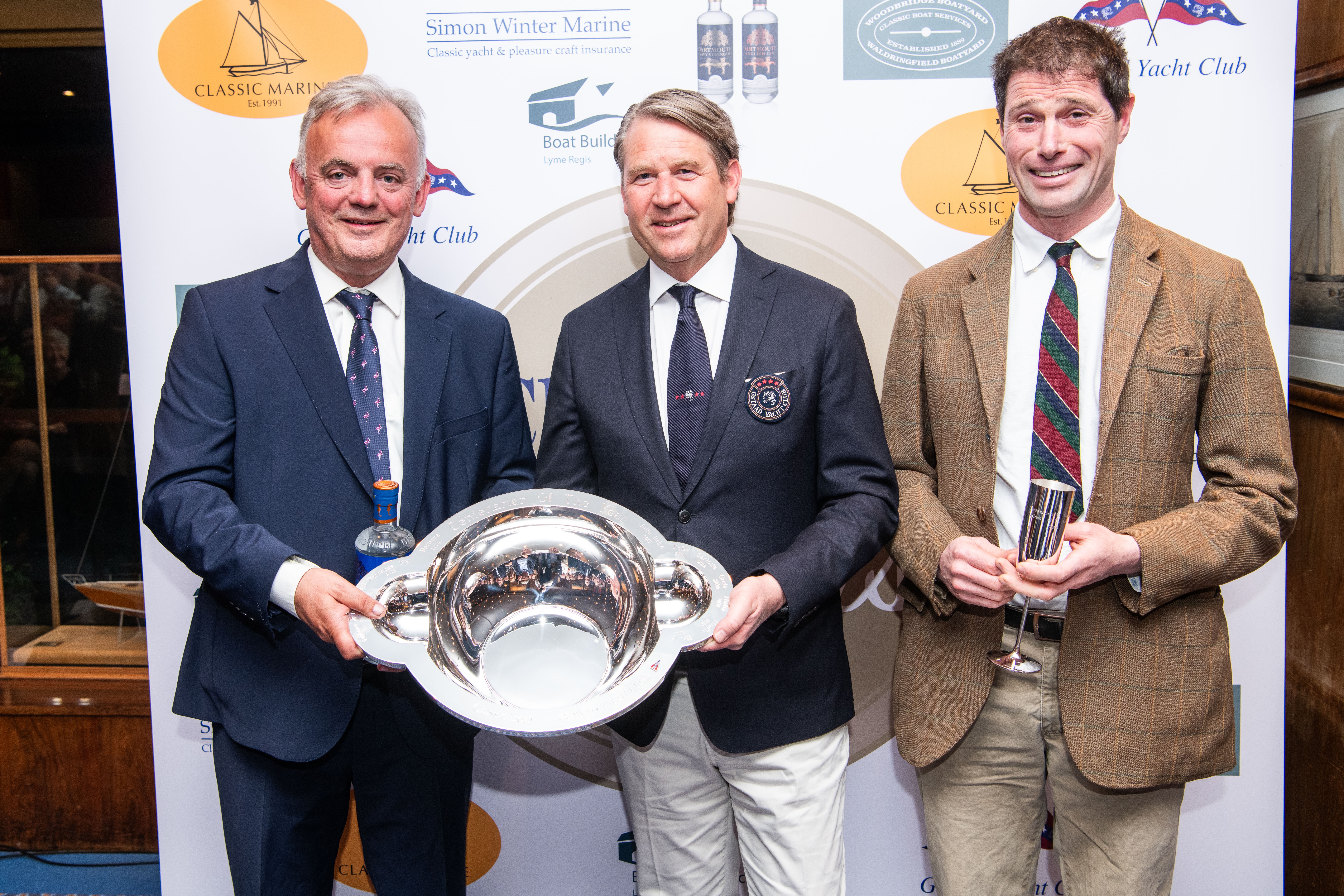 Photo: Rob Murray, Chair of Vigilance Trustees (left) and Will Stirling, MD of Sterling and Son Limited (right) accepting the Gadstaad trophy from Daniel Heine of the Gstaad Yacht Club at the Classic Boat Awards in London last night. © Marcus Holdsworth